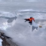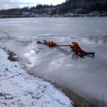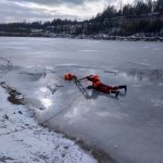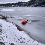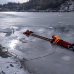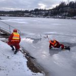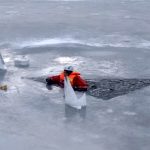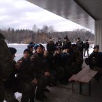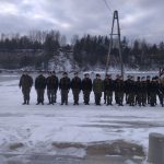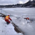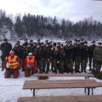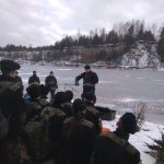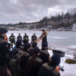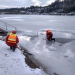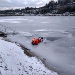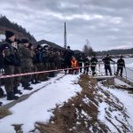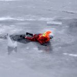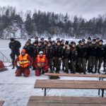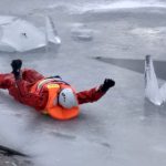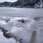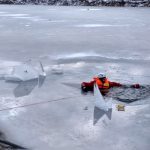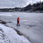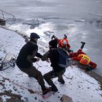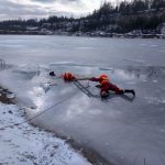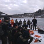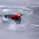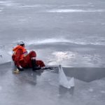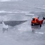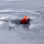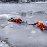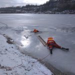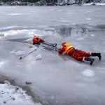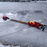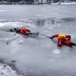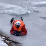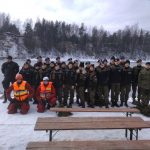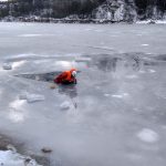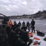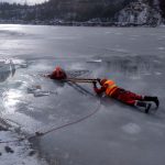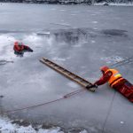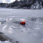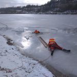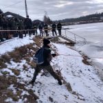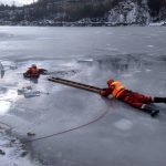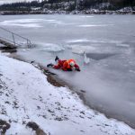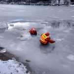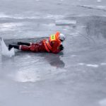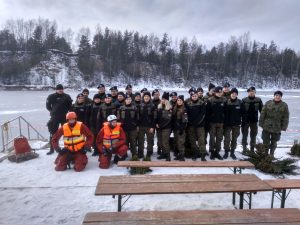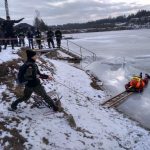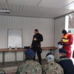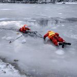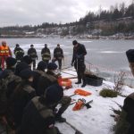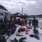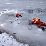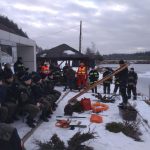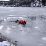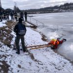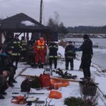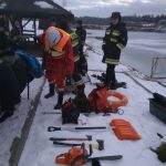 Strażacy zaprezentowali uczniom, jak można udzielić pomocy przy użyciu przygodnego sprzętu osobie poszkodowanej, która wpadła do przerębla. Szkolenie przeprowadzał pan Jakub Szuster jeden z niewielu Polaków którzy dokonali nurkowania pod lodem na dno jeziora Hańcza.