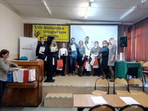 jako przekaz perswazyjny”. Wreszcie nastąpiła długo wyczekiwana chwila prawdy. Kto okaże się mistrzem ortografii? Jury wyłoniło laureatów pierwszych trzech miejsc w trzech kategoriach: uczniowie szkół podstawowych, uczniowie szkół ponadpodstawowych i ponadgimnazjalnych oraz osoby dorosłe. Miło nam poinformować, że uczeń naszej szkoły – Mateusz Żegleń z kl. I C – stanął na podium wśród nagrodzonych, zajmując III miejsce w kategorii uczniów szkół ponadgimnazjalnych.