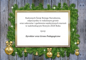 Radosnych Świąt Bożego Narodzenia, odpoczynku w rodzinnym gronie, oraz sukcesów i spełnienia najskrytszych marzeń w nadchodzącym Nowym 2020 Roku – życzy Dyrektor oraz Grono Pedagogiczne