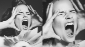 Pewnie zastanawiacie się, co daje lampa na sankach. W związku z tym, że lampa główna błyskała dużo mocniej niż systemówka, elementy oświetlone przez beauty disha pozostały w niemal nienaruszonej kolorystyce. Z kolei miejsca, gdzie pojawił się cień rzucony przez ten modyfikator, zostały wypełnione granatowym światłem lampy systemowej, stąd niebieski zafarb w ciemnych częściach kadru. Żeby osiągnąć podobny efekt, lampa na sankach musi błyskać zdecydowanie słabiej niż lampa główna, tak żeby jej światło rozjaśniało jedynie cienie i nie miało wpływu na całość oświetlenia. W Photoshopie tylko podbić kontrast i użyć narzędzi D&B.