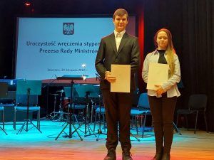 W Młodzieżowym Domu Kultury im. Jaworzniaków miała miejsce uroczystość wręczenia Stypendium Prezesa Rady Ministrów, które jest przyznawane od 2006 r. Dla uczniów naszej szkoły Lucyny Jordan i Jakuba Swerczek, którzy otrzymali promocję z wyróżnieniem, uzyskując przy tym najwyższą średnią ocen w ubiegłym roku szkolnym, jest to najważniejsze wyróżnieniem. Śląski Wicekurator Oświaty Jacek Szczotka wraz z panią Dyrektor Delegatury w Sosnowcu Mirosławą Kolwas-Soczyńska wręczyli piękne, pamiątkowe dyplomy, gratulując uczniom szkół średnich.