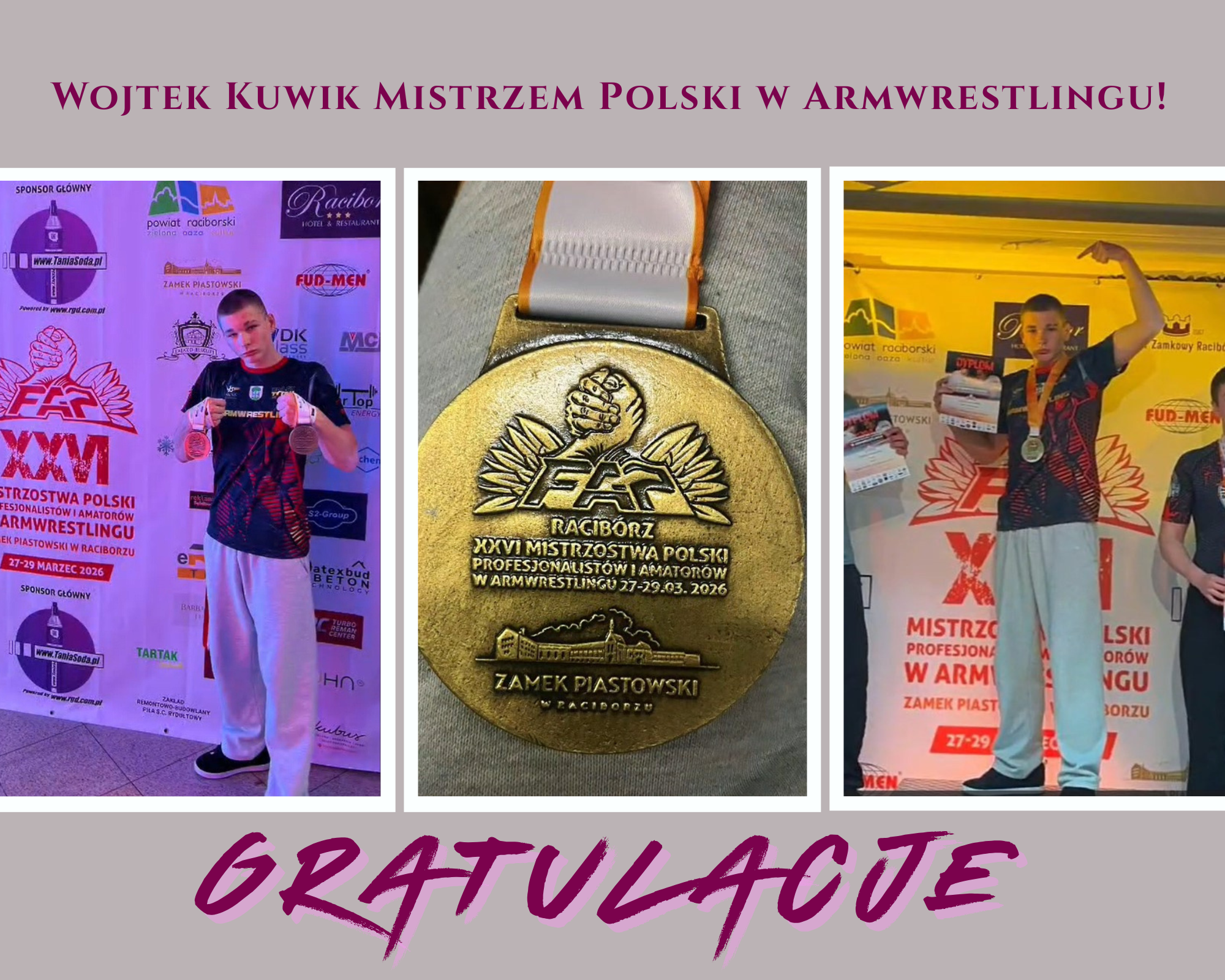 Z olbrzymią dumą i radością pragniemy poinformować całą społeczność szkolną o spektakularnym osiągnięciu ucznia naszej szkoły. Wojtek Kuwik, uczeń klasy 3a Oddziału Przygotowania Wojskowego (OPW), udowodnił, że jest najsilniejszym juniorem w Polsce, zdobywając tytuł Mistrza Polski w siłowaniu na rękę!