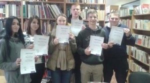 Uczniowie IV Liceum Ogólnokształcącego w Zespole Szkół Ponadgimnazjlanych nr 2 w Jaworznie wchodzący w skład Młodzieżowej Służby Ruchu Drogowego odebrali certyfikaty poświadczające odbycie szkolenia w ramach akcji „Z młodym kierowcą w drodze po doświadczenie” zorganizowanego przez CARGO Jaworzno, Komendę Wojewódzką Policji i KM Policji w Jaworznie.