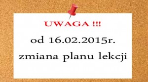 Informujemy, że od 16.02.2015 (poniedziałek) nastąpi zmiana planu lekcji. Przypominamy o podziale na grupy na zajęciach praktycznych klasa II H i klasa III H (technik informatyk).