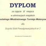 Uczniowie IV Liceum Ogólnokształcącego z Zespołu Szkół Ponadgimnazjalnych nr 2: Łukasz Brzozowski, Makary Maciejewski, Dominik Walczak zajęli II miejsce w eliminacjach miejskich Ogólnopolskiego Młodzieżowego Turnieju Motoryzacyjnego.